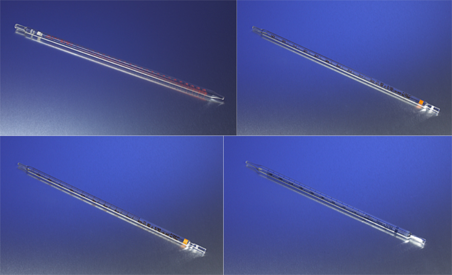 - Pipetas serológicas de vidrio reusables, codificadas por color, marcas de color. Calibradas para entregar (TD - To Deliver). Capacidades de 0.1ml, 0.2ml, 1ml, 2ml, 5ml y 10ml. Graduaciones de 0.01ml y 0.1ml.