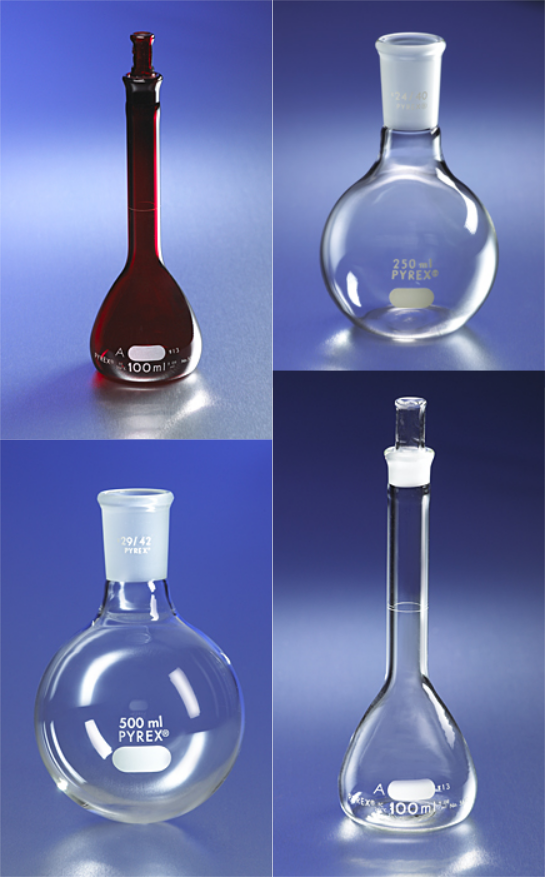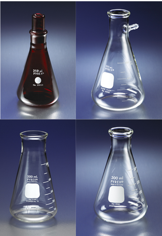 - De boca angosta con paredes uniformes, para ofrecer un balance entre resistencia mecánica y choque térmico (PYREX VISTA), con capacidades de 25ml, 50ml, 125ml, 250ml, 500ml.